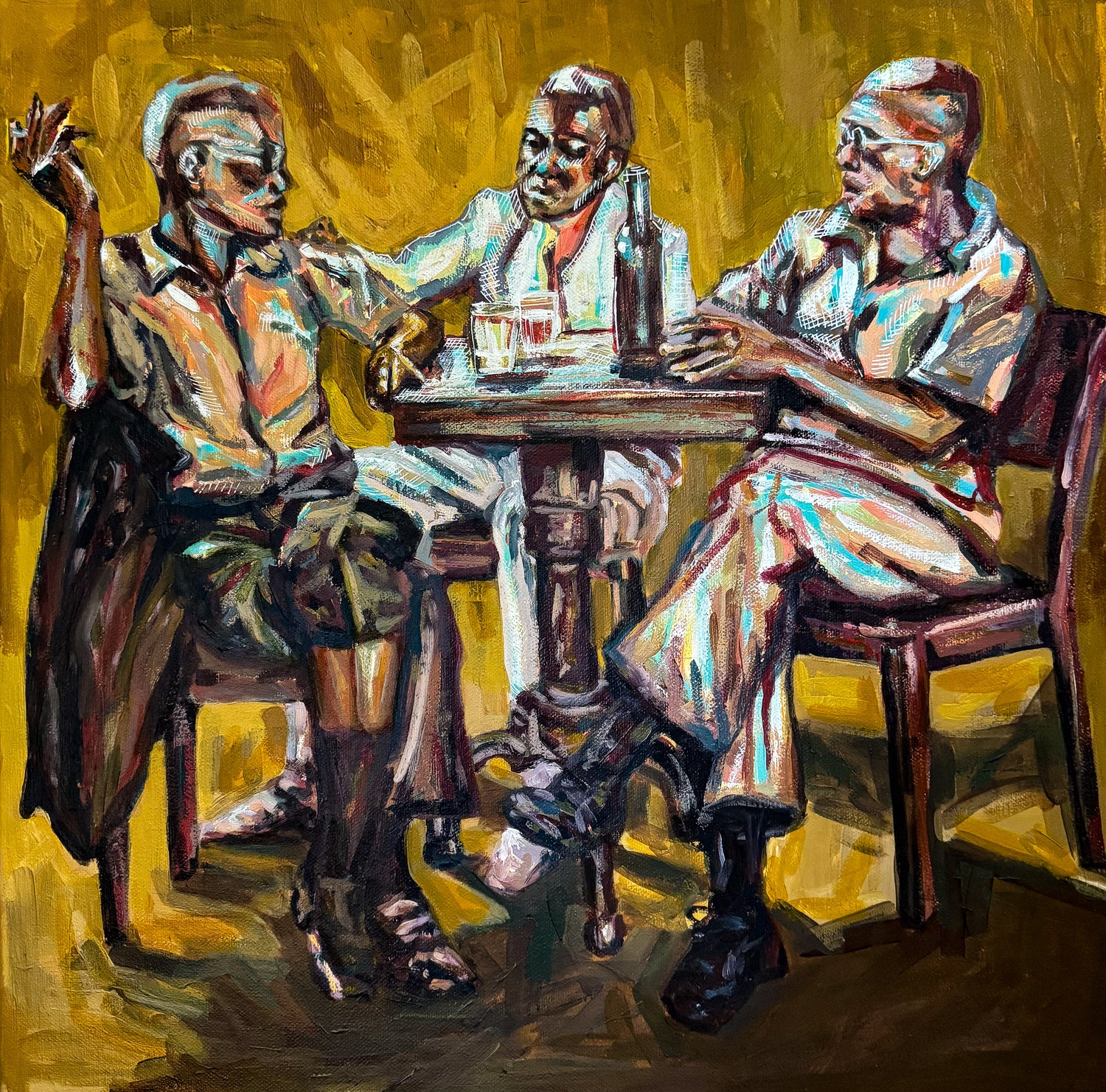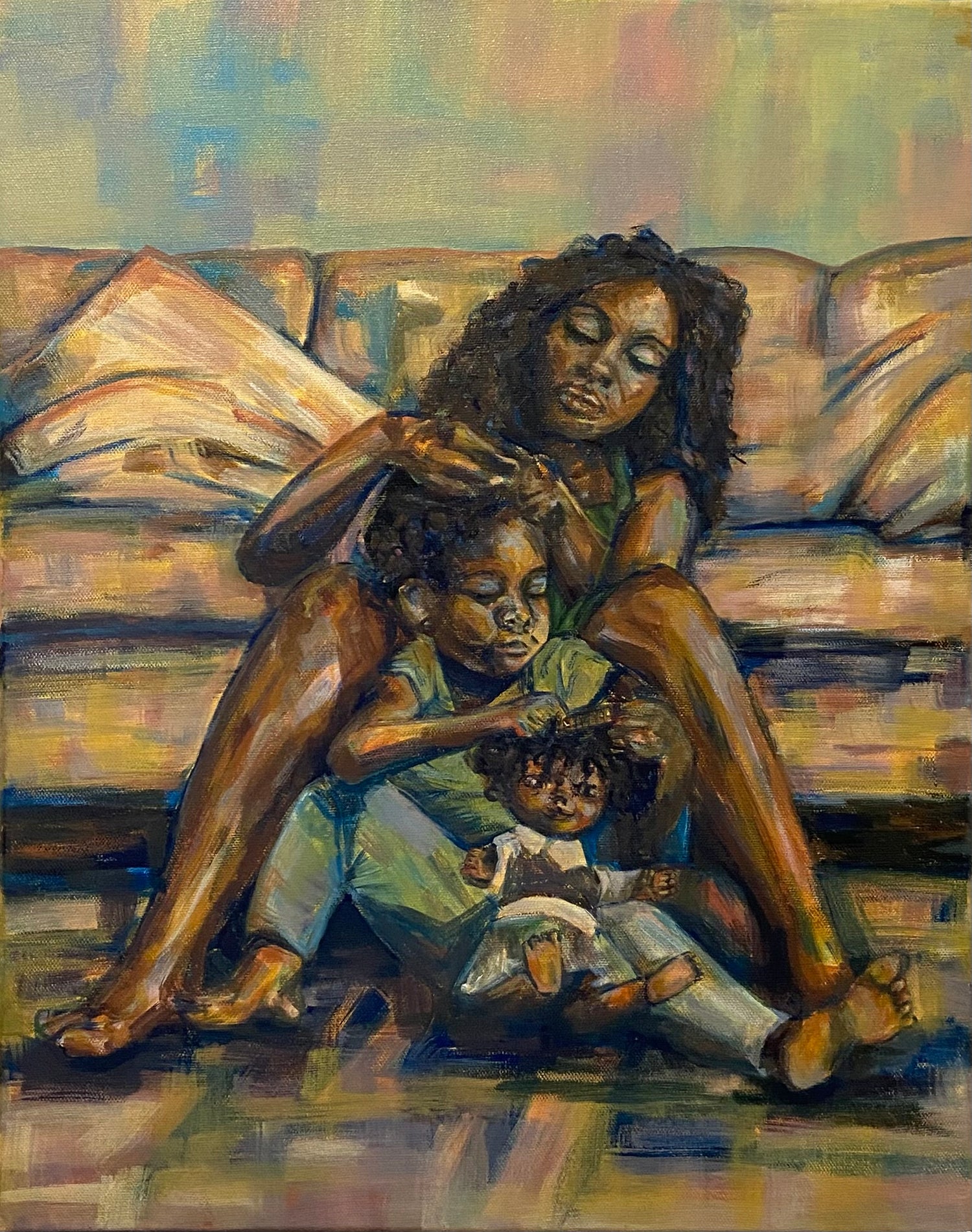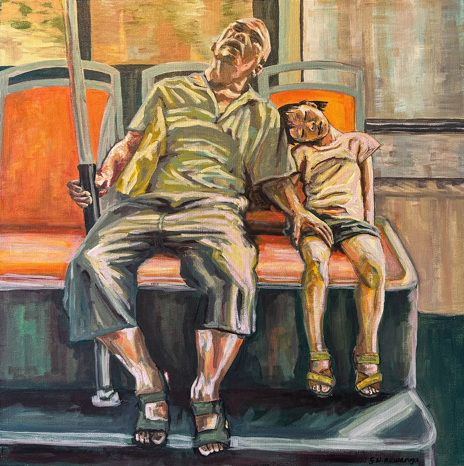 This piece captures an intimate, fleeting moment of rest shared across generations. The warm tones and expressive brushwork aim to evoke a sense of everyday humanity and reflect on connection, care and the beauty of everyday life.