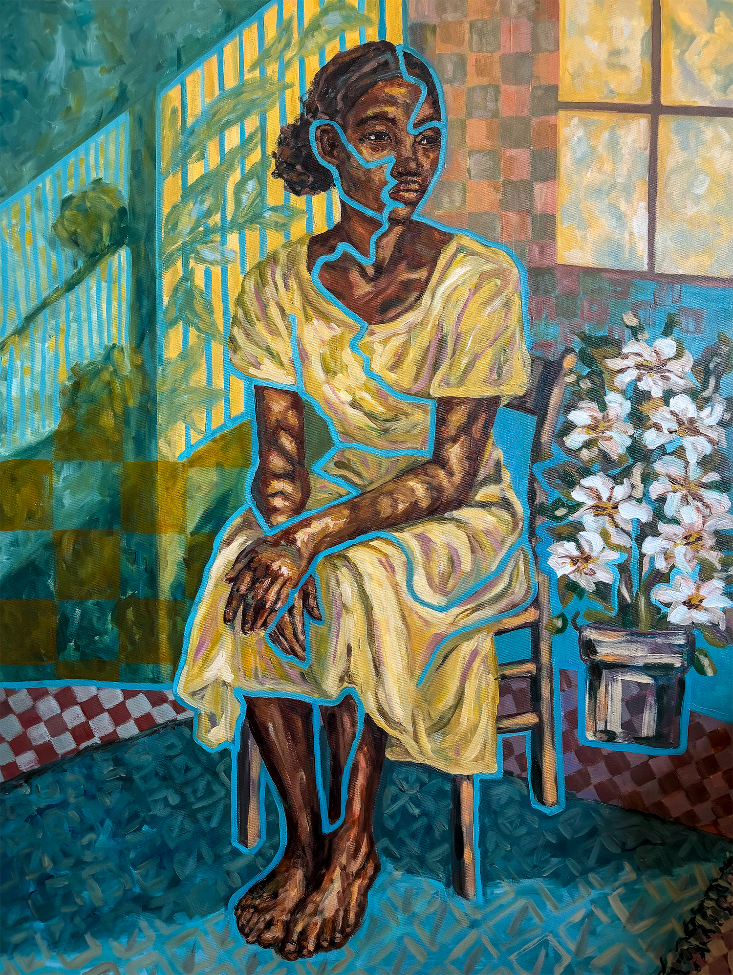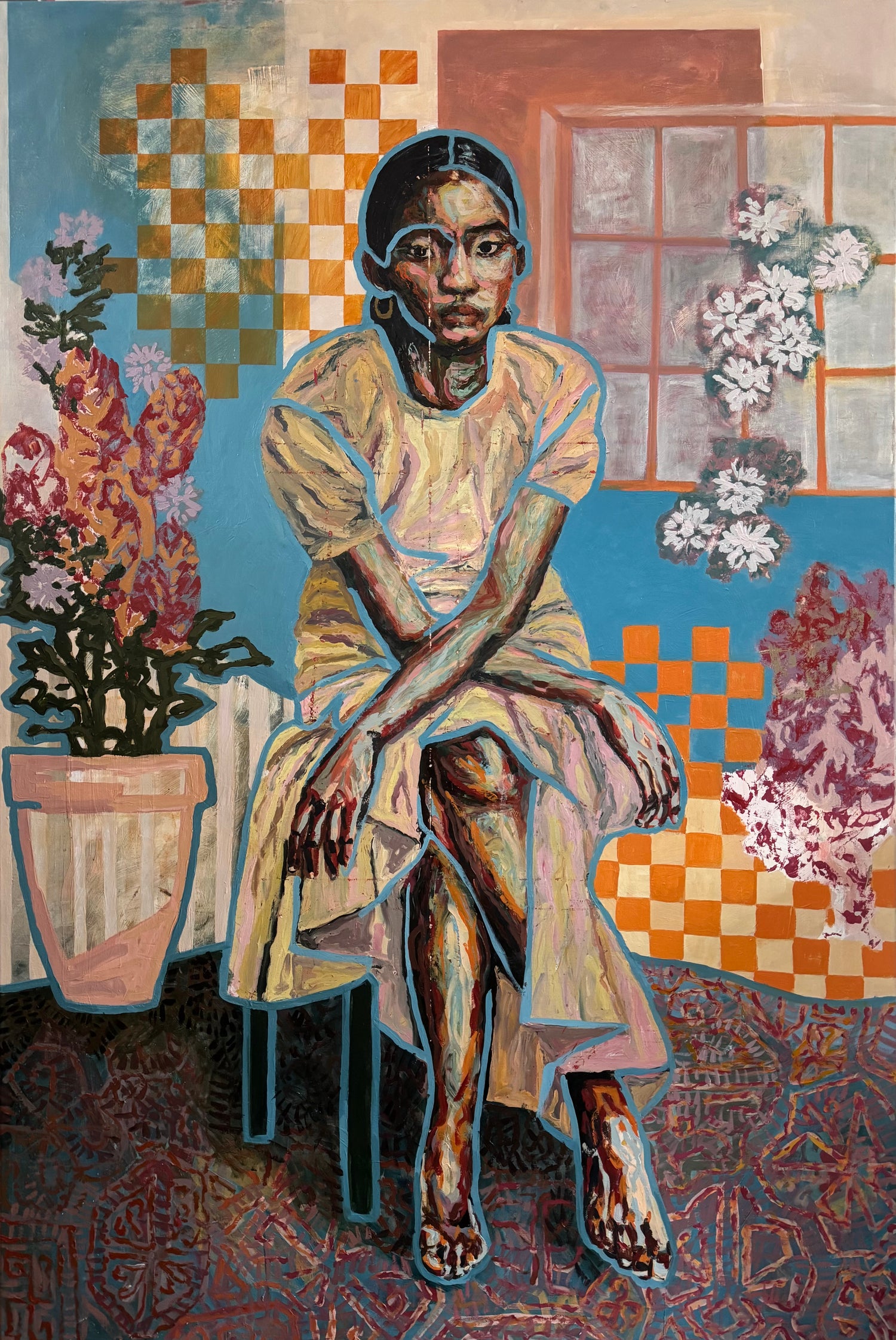 This piece captures a quiet moment of stillness. The figure is resting but not entirely at ease, slightly detached from her surroundings. The floral backdrop feels soft and almost dreamlike, but the outline holds her apart. It reflects that feeling of being present but slightly outside.